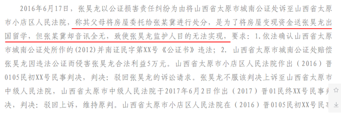 北京朝阳法院调查后了解到,2012年12月31日,张昊龙父母委托名为张某翼的人代为办理涉案房屋出租、出售、房产抵押等相关手续,该房屋建筑面积为703.13平方米,成交价格为3600万元。