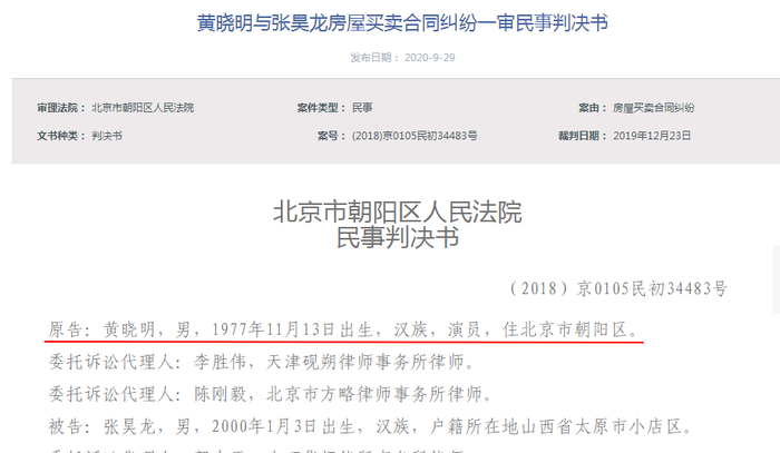 9月29日,北京法院审判信息网公开了一份“黄晓明与张昊龙房屋买卖合同纠纷一审民事判决书”。
