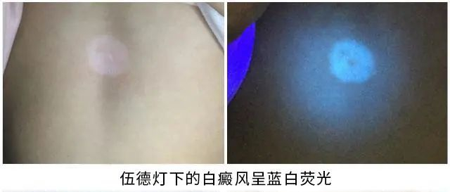 伍德灯下的白癜风皮损呈现蓝白荧光反应,与周围正常皮肤对比鲜明,界限清楚。伍德灯可以检测到肉眼看不到的隐形白斑,辨别是【完全性】还是【不完全性白癜风】,还可检查出肉眼看不见的已经发生的病变。