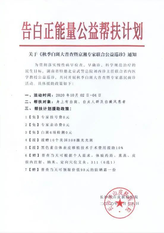 十·一黄金周期间,长沙华山皮肤病医院白癜风治疗专家将联合原北京武警总医院皮肤科副主任医师刘西珍共同开展秋季白斑大普查暨专家惠民面诊活动,同时多家爱心企业将参与对贫困白癜风患者的帮扶资助。