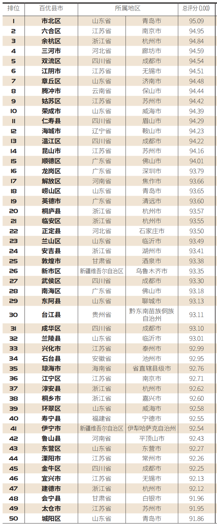 青岛市市北区(第1)、济南市章丘区(第7)、威海市荣成市(第10)、青岛市崂山区(第18)、临沂市兰山区(第23)、聊城市东阿县(第29)、临沂市兰陵县(第32)、威海市环翠区(第39)、东营市东营区(第43)、青岛城阳区(第50)、威海市乳山市(第52)、淄博市博山区(第59)、烟台市莱州市(第70)、临沂市蒙阴县(第81)、烟台市牟平区(第85)、临沂市沂南县(第91)、威海市文登区(第93)、临沂市莒南县(第97)。