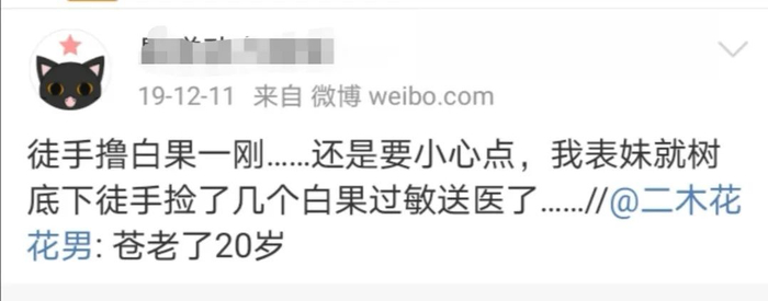 市民们如果要捡白果需注意,如果皮肤接触到白果的汁液,汁液通过皮肤渗入体内,可能导致IV型变态反应,可累及全身器官和组织,轻者引起红斑、肿胀、水疱、大疱、糜烂等,严重时可发生呼吸困难、肺水肿和过敏性休克等。