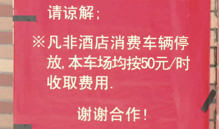 鸣虹酒店经理 肖先生:这50元只是吓一下人的,因为我们不想外来车辆停放。我们停车费是按系统自动收费的,那里设置是16元一个小时。