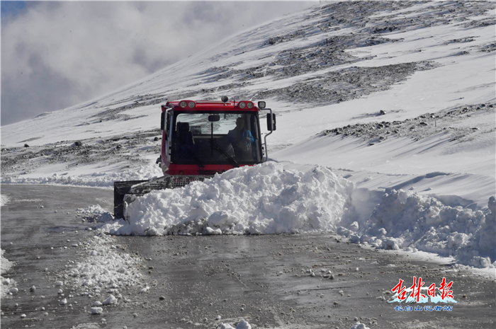 在记者驱车前往主峰的路上,岳桦林与远方的层林浸染,交相呼应仿佛一幅水墨画,令人陶醉。车行驶到海拔2200米时白雪开始成为大山的主色调,到达海拔2400米以上时,积雪形成了一定的厚度。这时记者先后看到2辆大型清雪车,3辆拖滚除雪车辆同时作业,在前往主峰的盘山公路上分段实施清雪。