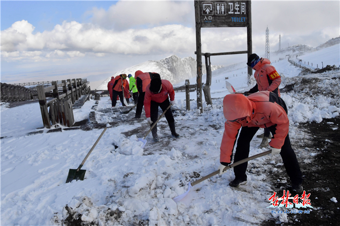 中午11时许,主峰景区管理部的全体同仁迅速上山,展开了一场清雪战斗。
