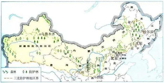 三北防护林分布图 ▲