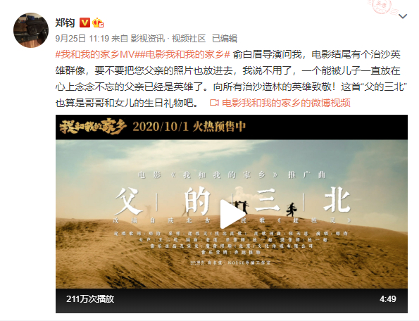 郑钧催泪献唱《我和我的家乡》推广曲《父的三北》:能让儿子念念不忘的父亲就是英雄
