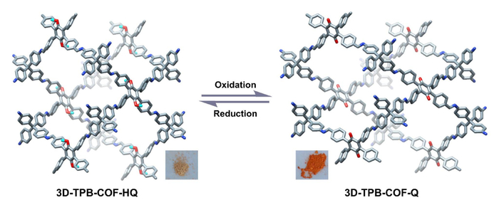 前期研究中,汪成课题组提出了“4+4”连接方式来构筑三维COFs的拓扑设计新策略(J. Am. Chem. Soc. 2016,138, 3302;Acc. Chem. Res. 2020, doi: 10.1021/acs.accounts.0c00357)。本工作中,他们基于该策略,构筑了首例具有氧化还原响应性的三维COF(3D-TPB-COF-HQ)。通过外加氧化剂和还原剂,框架中氢醌和醌将发生可逆转换,伴随着单晶到单晶的变化过程。同时,调控前后其孔环境发生较大变化,进而导致CO2/N2选择性吸附能力变化。值得一提的是,该过程具有很好的可逆性和循环性,可至少重复进行三次。此研究充分说明,三维COFs可为固态下有机分子开关的高效调控提供了一个极佳的研究平台,同时可构筑新型响应性多孔材料。