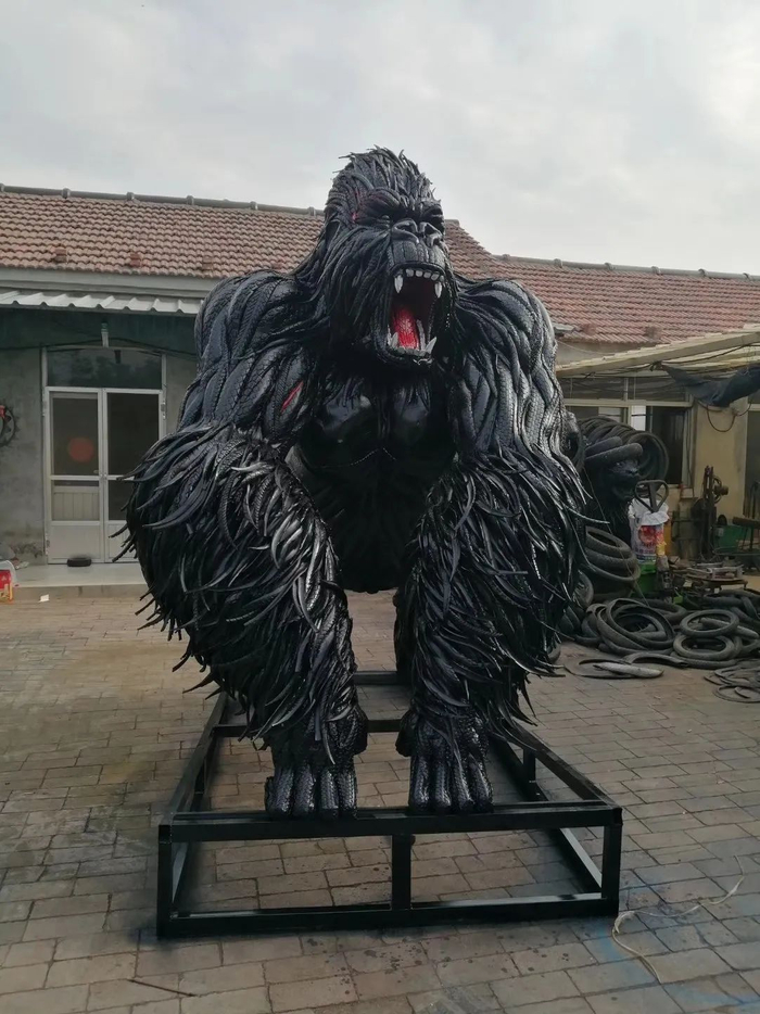 白鸥介绍,现在他做的作品仅雕塑类就有一百多件,其中有三米高的金刚,七米长的恐龙等等。主骨、塑型、装饰等等让作品栩栩如生,白鸥说,动物身上的肌肉不是焊接出来的,而是用轮胎一层一层拼起来的,这样才能在表面弄出更加逼真的肌肉走向和纹理。