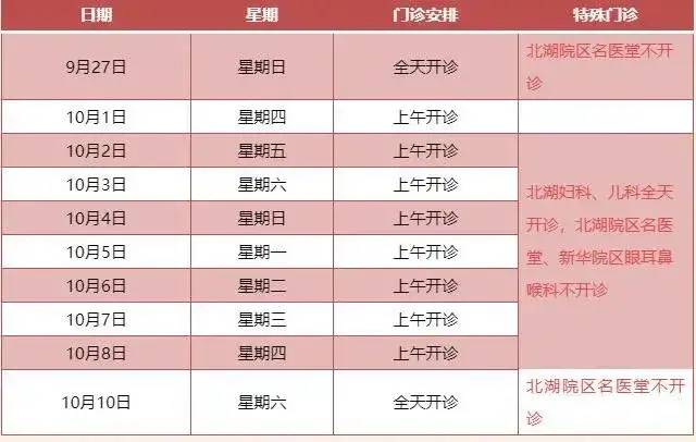 2.医院各门诊10月1日(星期四)至10月3日(星期六)全天休诊;10月4日(星期日)至10月6日(星期二)上午8:00-12:00开诊,下午休诊;10月7日(星期三)、10月8日(星期四)、10月10日(星期六)全天开诊。