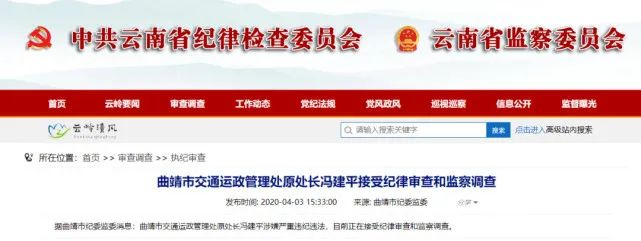 今年4月3日,据云南省纪委省监委网站消息,曲靖市交通运政管理处原处长冯建平涉嫌严重违纪违法,接受纪律审查和监察调查。
