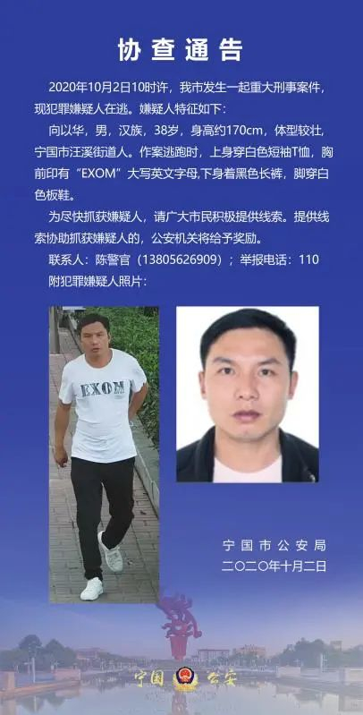 2020年10月2日10时,宁国市河沥溪街道发生一起故意杀人案,导致一人当场死亡,另一人经抢救无效后死亡。案件发生当日,宁国市公安局立即发布协查通告,向广大市民征集线索。