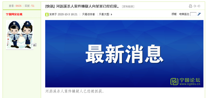 18:20,犯罪嫌疑人向某被抓获。宁国市公安局在当地论坛上发布最新消息。