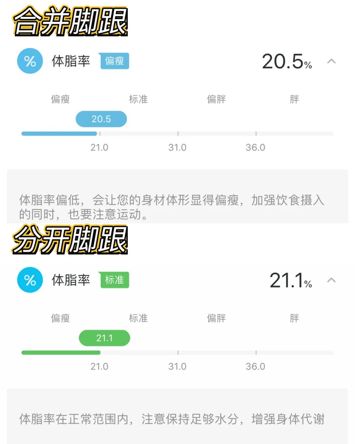 再次并拢脚后跟,但双脚仍踩在电极片上测量,测出来的结果为20.5%。