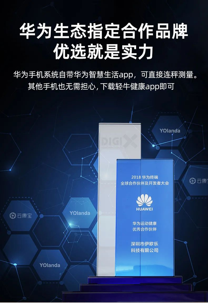 1、华为生态指定合作品牌,测体脂、心率、BMI等23项重要的身体数据,让你更了解自己的身体;