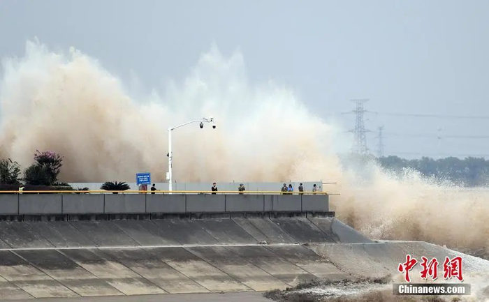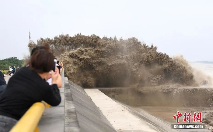 10月3日,钱塘江大潮撞击堤坝后激起巨浪,吸引市民拍照。当日是农历八月十七,在浙江嘉兴盐仓江畔,钱塘江大潮奔涌而上,十分壮观。中新社记者 王刚 摄