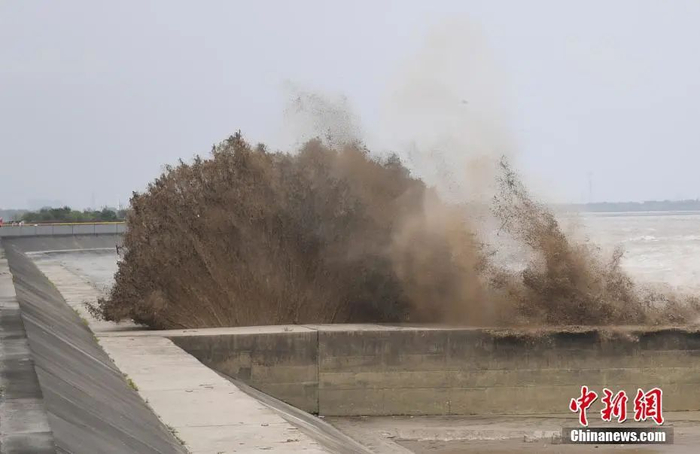 10月3日,钱塘江大潮在撞击堤坝后掀起巨浪。当日是农历八月十七,在浙江嘉兴盐仓江畔,钱塘江大潮奔涌而上,十分壮观。中新社记者 王刚 摄