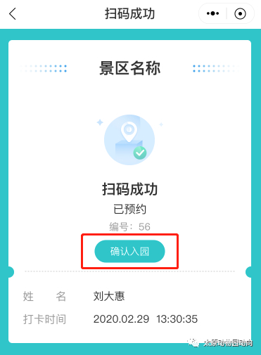 正常扫码成功的页面截图如下,有彩色的“确认入园”按钮。