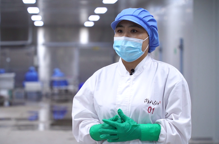 「工厂工作人员介绍:“我们工人的工作服每天下班以后,挂在更衣室经过紫外线消毒,然后,上班的时间,工人穿工作服以后要进行手消毒。加工过程中每小时要用75%的酒精进行手消毒或者案台消毒;工作结束后,车间在密封的状态下,进行2个小时的臭氧杀菌”」