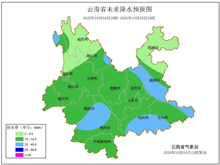 10月4日20时--10月5日20时:曲靖南部、昆明东部和北部、文山东部和南部、红河南部、怒江北部阴有中到大雨局部暴雨,曲靖中部、文山中部、昆明西部、玉溪、红河北部、楚雄、普洱、西双版纳、临沧、大理、德宏、保山、丽江东部阴天间多云有小到中雨局部大雨,其它地区多云有阵雨局部中雨。