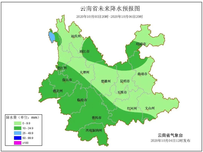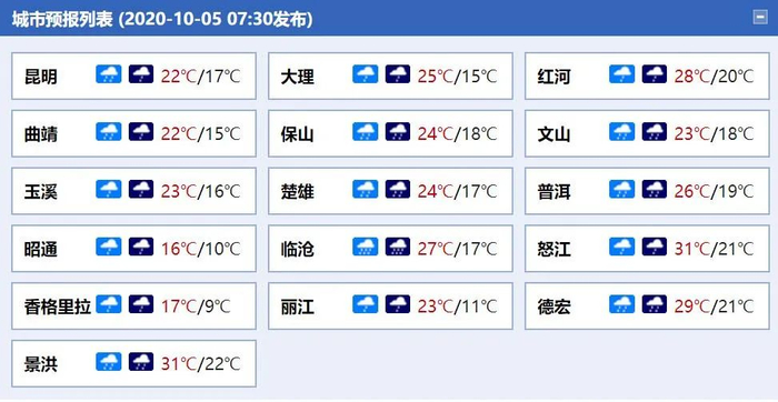 10月5日20时--10月6日20时:怒江北部、昭通南部、曲靖北部、昆明北部、丽江东部、大理西部、保山、德宏、临沧、普洱、西双版纳、红河南部、文山南部阴天间多云有小到中雨局部大雨,其它地区多云有阵雨局部中雨。