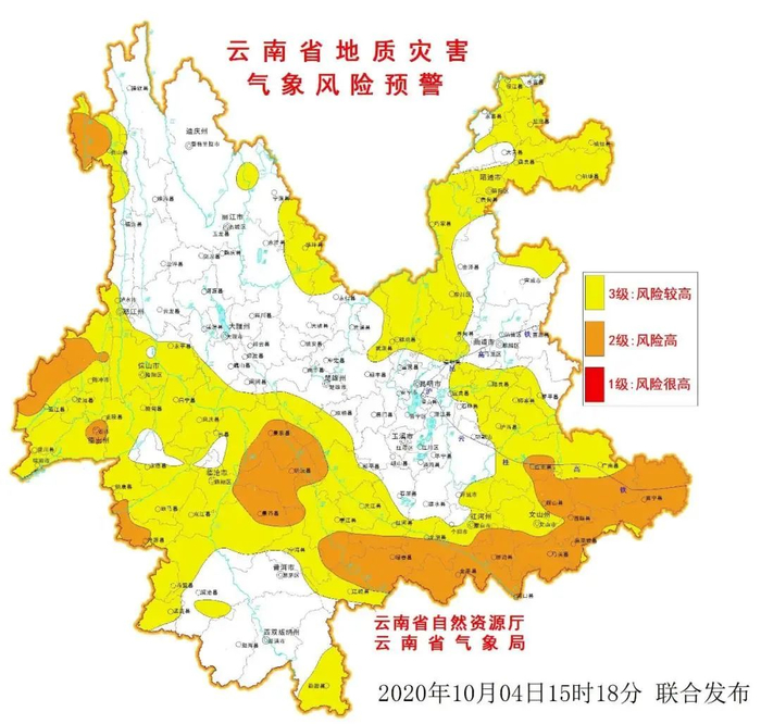 2020年10月04日20:00~10月05日20:00,怒江、德宏、保山、临沧、普洱、红河及文山部分地区发生滑坡泥石流的风险高;昭通、曲靖、怒江、丽江、德宏、保山、临沧、西双版纳、普洱、红河、文山、楚雄、玉溪及昆明部分地区发生滑坡泥石流的风险较高。