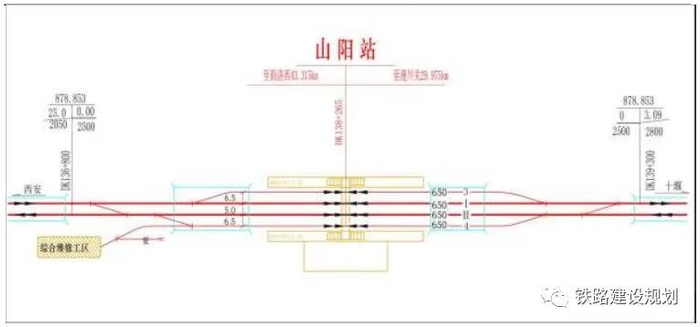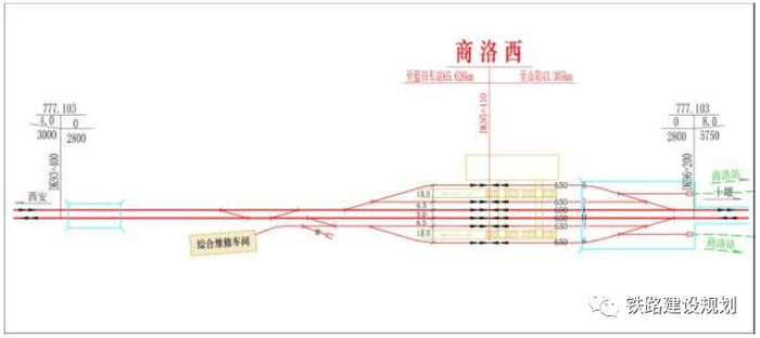 车站设计总规模2台6线,车站设到发线6条(含正线2条),有效长650m,设岛式中间站台2座,10m宽跨线天桥2处,十堰端咽喉预留与宁西线商洛站间联络线接入条件。站房位于线路左侧,站型采用线侧上式,站房面积 12000㎡ 。车站西安端站房对侧设有综合维修车间1处。