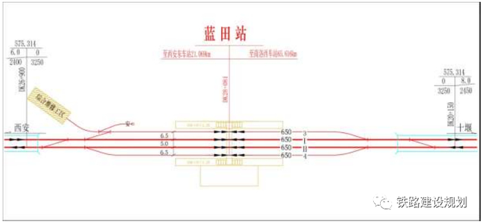 车站按总规模2台4线布置,设到发线4条(含正线2条),基本站台和侧式中间站台各1座,8m宽跨线地道1座,到发线有效长650m。站房位于线路右侧,站型采用线侧平式,站房面积5000㎡。车站西安端站房对侧设综合维修工区1处。