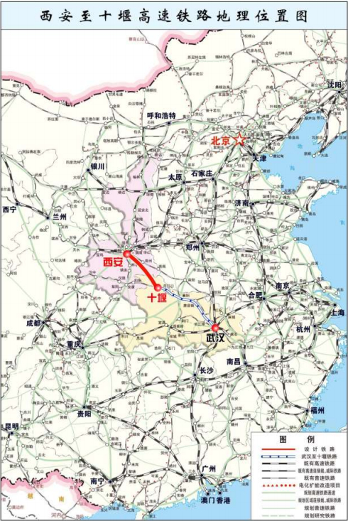 本线为西安至武汉高铁的组成部分,目前,武汉至十堰铁路孝感东至十堰东段已开通,且十堰东站已按西十铁路接入后的总规模一次建成,在十堰东站西安端神定河桥头预留了西十铁路正线直接接轨条件。