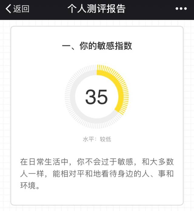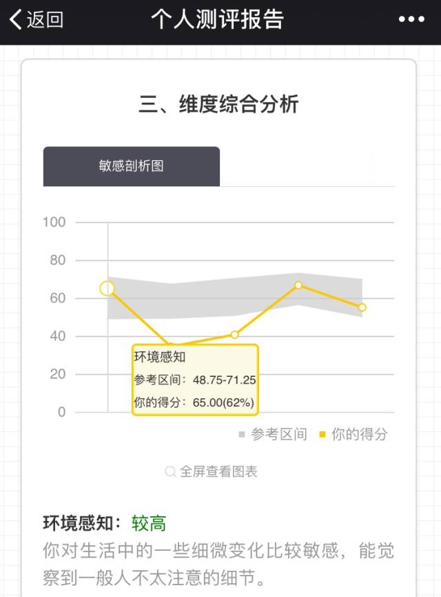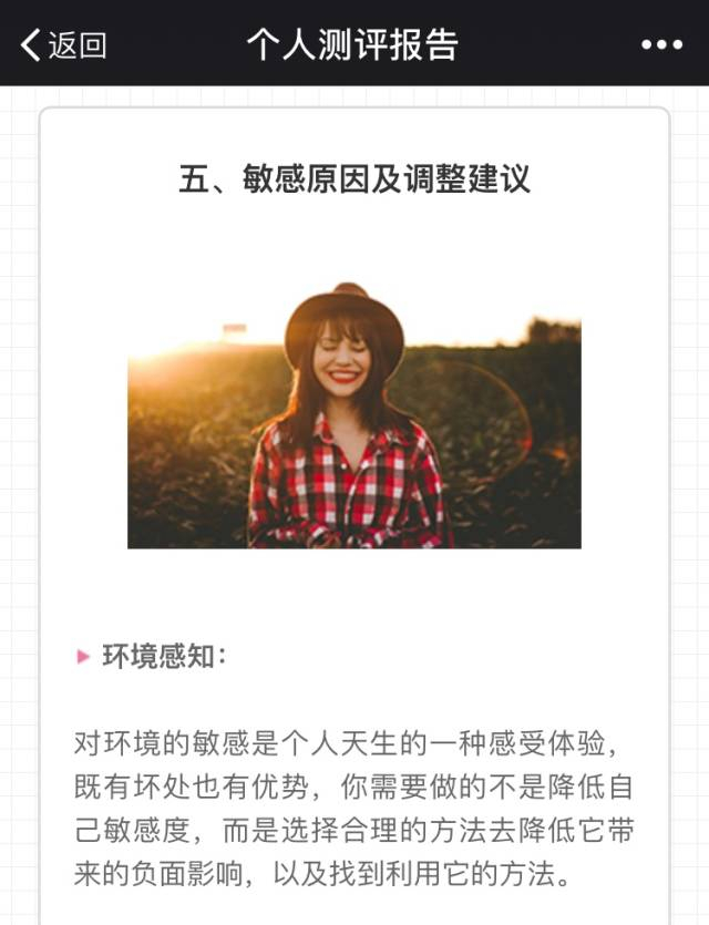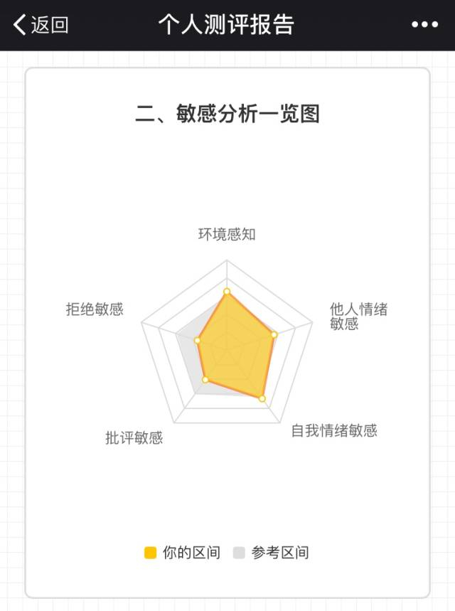 「心理敏感度评估」从环境感知、拒绝敏感、批评敏感等5个维度综合分析你的敏感指数,剖析敏感给你带来的苦恼和优势,并提供相关建议。