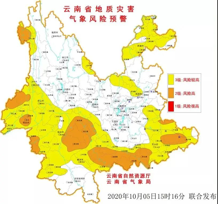 10月5日20时0~10月6日20时, 怒江、德宏、临沧、普洱、红河、文山部分地区发生滑坡泥石流的风险高;昭通、曲靖、怒江、丽江、德宏、临沧、普洱、红河、文山及昆明部分地区发生滑坡泥石流的风险较高。