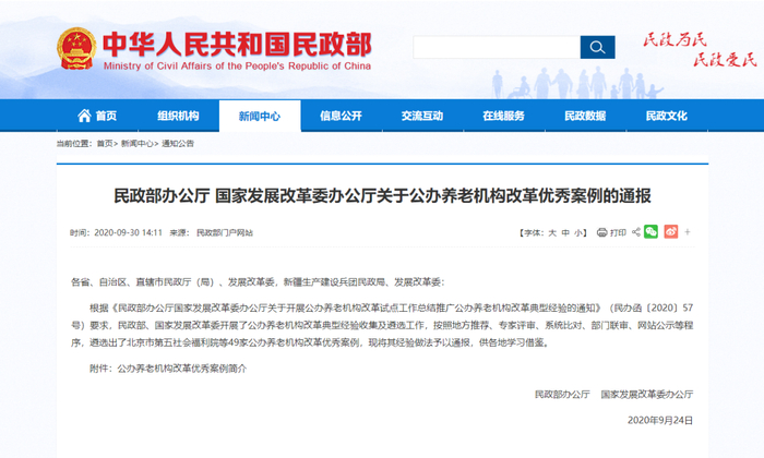 民政部、国家发展改革委近日发布了关于公办养老机构改革优秀案例的通报,遴选出了北京市第五社会福利院等49家公办养老机构改革优秀案例,其中安徽两家上榜。