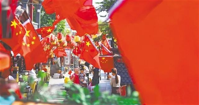 10月1日,山东省日照市东夷小镇商业街五星红旗迎风飘扬,来自全国各地的游客在此“打卡”,感受浓浓的节日氛围。“双节”假日全国各地商业区旅游景点巧打文化牌,激活假日经济。