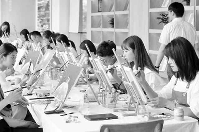9月29日,在山东省日照市城市书房樱花园馆内,许多年轻读者争相体验书店美术创作培训活动。日照市积极打造城市书房,读者除了免费共享全市公共图书馆142.1万册图书外,还可以参加非遗体验、艺术培训等特色文化活动。
