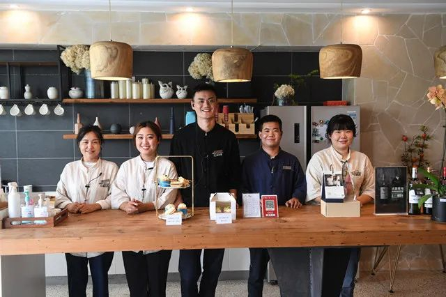在计家墩理想村,鲁刚刚(左三)和同事们在溪地清舍民宿内合影(9月27日摄)。来自山东临沂的鲁刚刚是溪地清舍民宿的“大管家”。学习酒店管理的他大学毕业后,先后在北京、上海的酒店工作。2019年,鲁刚刚通过朋友介绍来到理想村,成为这里的一名“新村民”。从乡村来到大城市,又从城市回到乡村,他最大的感受是这里统一规划、统一风格,将建筑设施与农村风貌相融合,既有大城市的便捷设施,又保留了乡村的自然舒适。