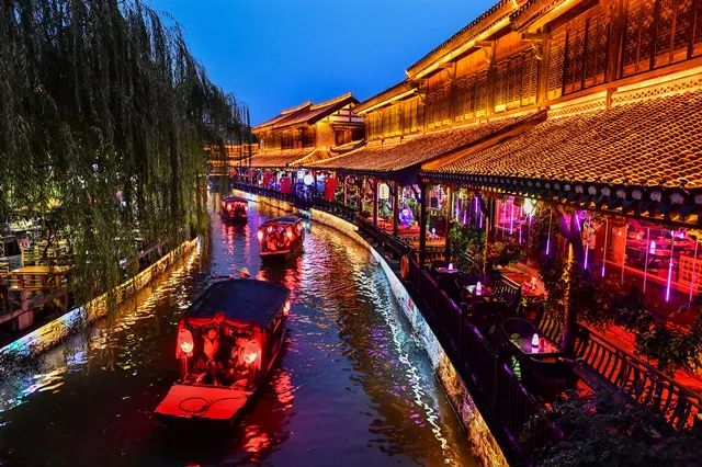 10月2日,游人乘船在山东台儿庄古城景区游览。