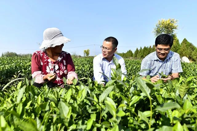 10月4日,在临沂市莒南县济生春茶源家庭农场,省派莒南县乡村振兴服务队队员朱冬冬(中)与采茶农交谈。当日,山东省省派莒南县乡村振兴服务队队员来到洙边镇茶溪川田园综合体,走进田间地头,了解群众在乡村振兴中的所需所盼。据悉,省派莒南县乡村振兴服务队自2018年9月进驻洙边镇以来,提出了现代农业科技园区、生态文化旅游园区和宜居宜业田园社区“三区”同建,促进地方经济社会发展。