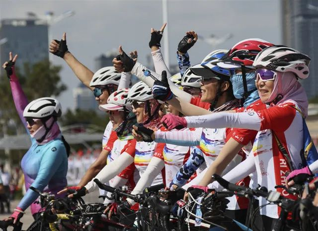 9月28日,日照市自行车爱好者们在万平口海滨广场集合,准备开始骑行。