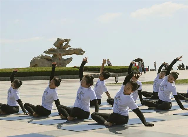 9月28日,瑜伽爱好者在日照万平口海滨广场练习瑜伽。