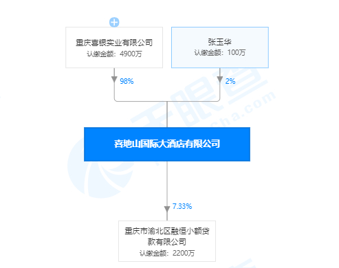 天眼查数据显示,喜地山国际实业有限公司成立于1999年10月,法定代表人张豫喜,注册资本1.4亿元,张豫喜占99.87%。而喜地山国际大酒店有限公司成立于2010年3 月,法定代表人张富豫,注册资本5000万元,为重庆喜银实业有限公司控股98%,而重庆喜银实业有限公司为重庆凯联恒润实业有限公司控股99.9%,重庆凯联恒润实业有限公司为重庆凯投实业有限公司99.9%控股,重庆凯投实业有限公司为重庆新本实业有限公司控股99%, 重庆新本实业有限公司为宝汇国际有限公司全资。