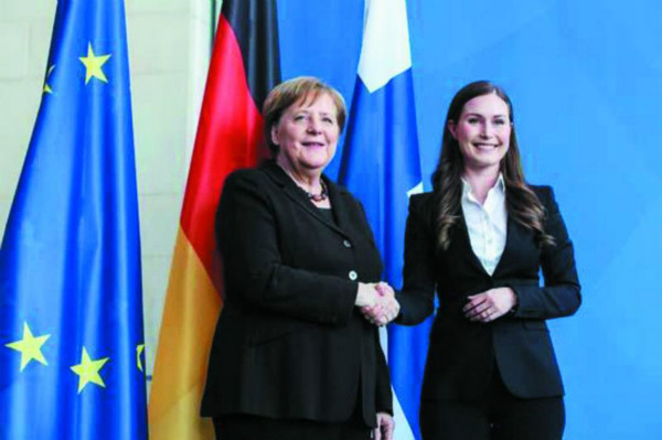 2020年2月,四连任的默克尔会见来访的芬兰总理马林