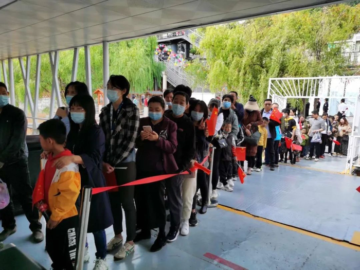 作为少见的国庆、中秋双节叠加,为了打造独特的双节出游体验,不少景区也举办了丰富多彩的文化活动,以吸引广大游客。兰州市的夜游黄河项目也吸引了不少游客。为喜迎国庆、中秋佳节,兰州水运集团精心为每位游客赠送小国旗及面贴,使每一艘游船上洋溢着欢乐、喜庆、祥和的节日气氛。此外,还举行了水上音乐节,以民谣、电音、古筝表演等多种形式,为游客呈现精彩的音乐盛宴。伴随着中山桥美轮美奂的炫彩灯光和强劲的音浪,在视觉和听觉的双重重击下,使南来北往的游客沉浸在美妙世界中。