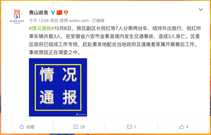 10月8日中午,武汉市青山区政府官方微博@青山政务通报:10月6日,该区副区长倪红等7人分乘两台车,结伴外出旅行,倪红所乘车辆共载3人,在安徽省六安市金寨县境内发生交通事故,造成3人身亡。