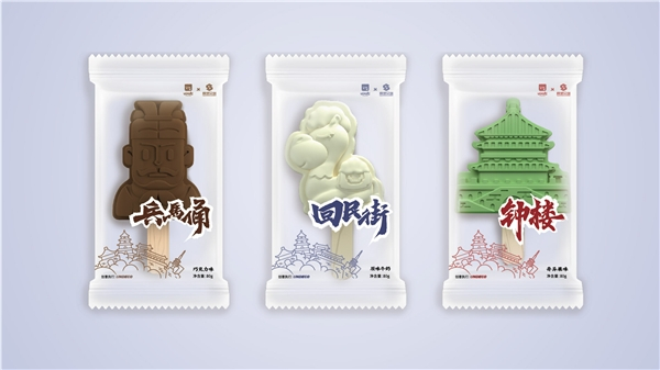 这是一份可以吃的文创产品,有趣、有历史、有文化的三种素材,做出了三款风味迥异的雪糕:牛奶味的小骆驼奶气十足、奇异果味的小钟楼生机盎然、巧克力味的兵马俑醇厚而浪漫。