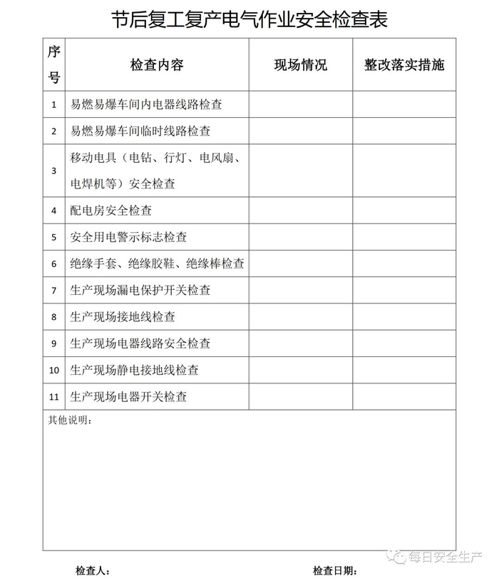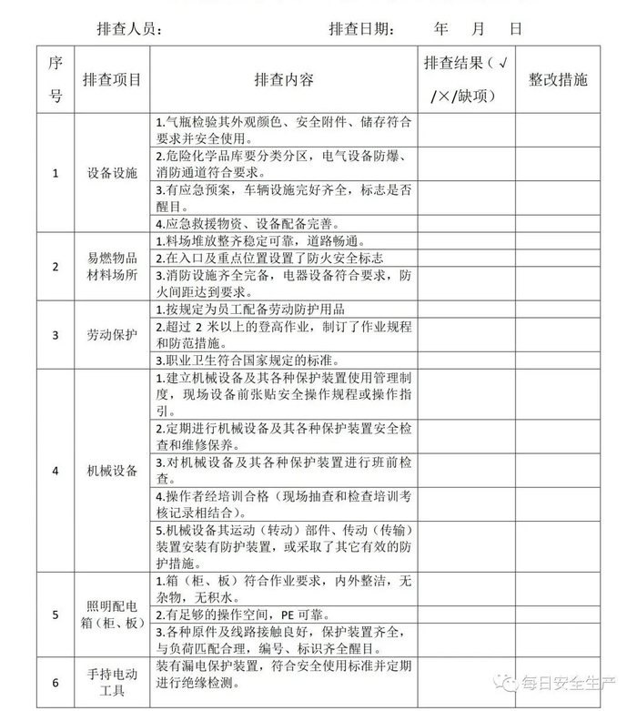 企业应在复工前对各类起重机械、生产车辆、动力管线、电气设备、手动工具进行全面检查、检修、检测,确保设备设施正常、安全运行。加强对脚手架、高处和临边孔洞安全防护、支撑防护、通风照明、应急通道等进行检查,确保安全可靠。应根据自身实际,彻底排查现场隐患,有效预防各类事故发生。