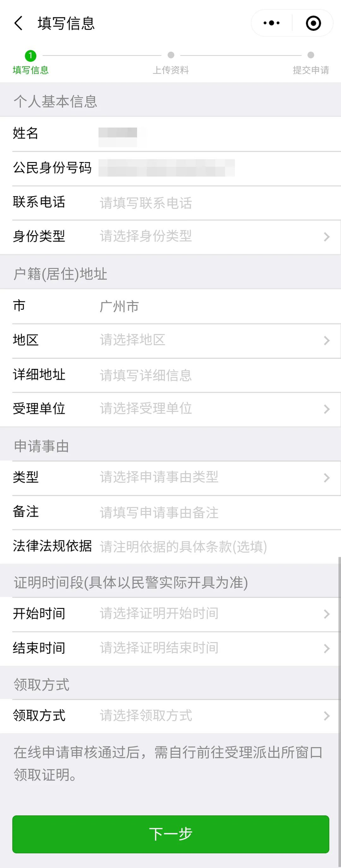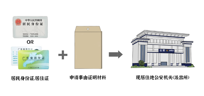 凭居民身份证、居住证,申请事由证明材料,向现居住地公安机关(派出所)申请办理在广东居住期间的无犯罪记录证明。居住时间以办理居住证时间为准,在广东跨地市的居住时间可合并计算。