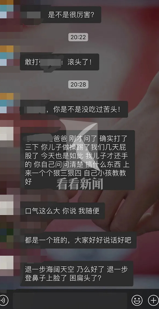 看看新闻Knews记者随后从相关部门了解到:家长微信聊天群中的“约架”内容属实。事情发生在9月30日上午,而家长“约架”的微信群里只有家长没有老师,老师从其他家长处得知后,已通知双方孩子妈妈到校准备处理此事。