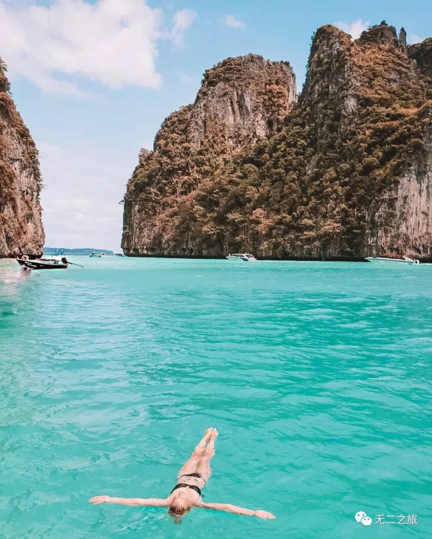 想要饱览更美的风光,不妨租一条特色小船,打卡电影《海滩》同款的玛雅海湾。这里是小皮皮岛的内湾,三面悬崖,水质清澈,沙子如奶粉般细滑。