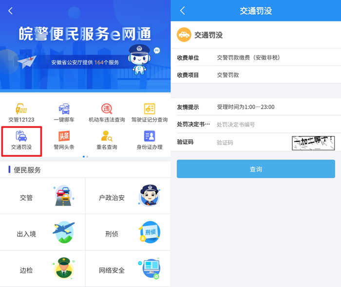 在“皖警便民”“交警12123”主页点击“交通违法业务”,查看已备案的机动车,点击“查询”,可查看未处理、已处理未交款、已交款及剩余可处理分数等信息。