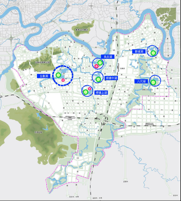 一江即以邕江为主轴和核心,三河以八尺江、良庆河、楞塘冲为水道;六湖以五象湖、良庆湖、楞塘上湖、楞塘中湖、新坡湖和八尺湖塑造城市公园,打造宜居生态的滨水开放空间;多水体以小型湖泊、生态池、居住区人工水道、公共广场水体等各类水体有机整合到城市用地布局中,强调其与城市主体水系的联系,使其有源可溯、有水可补、人工与自然相结合,动水与静水相互补。